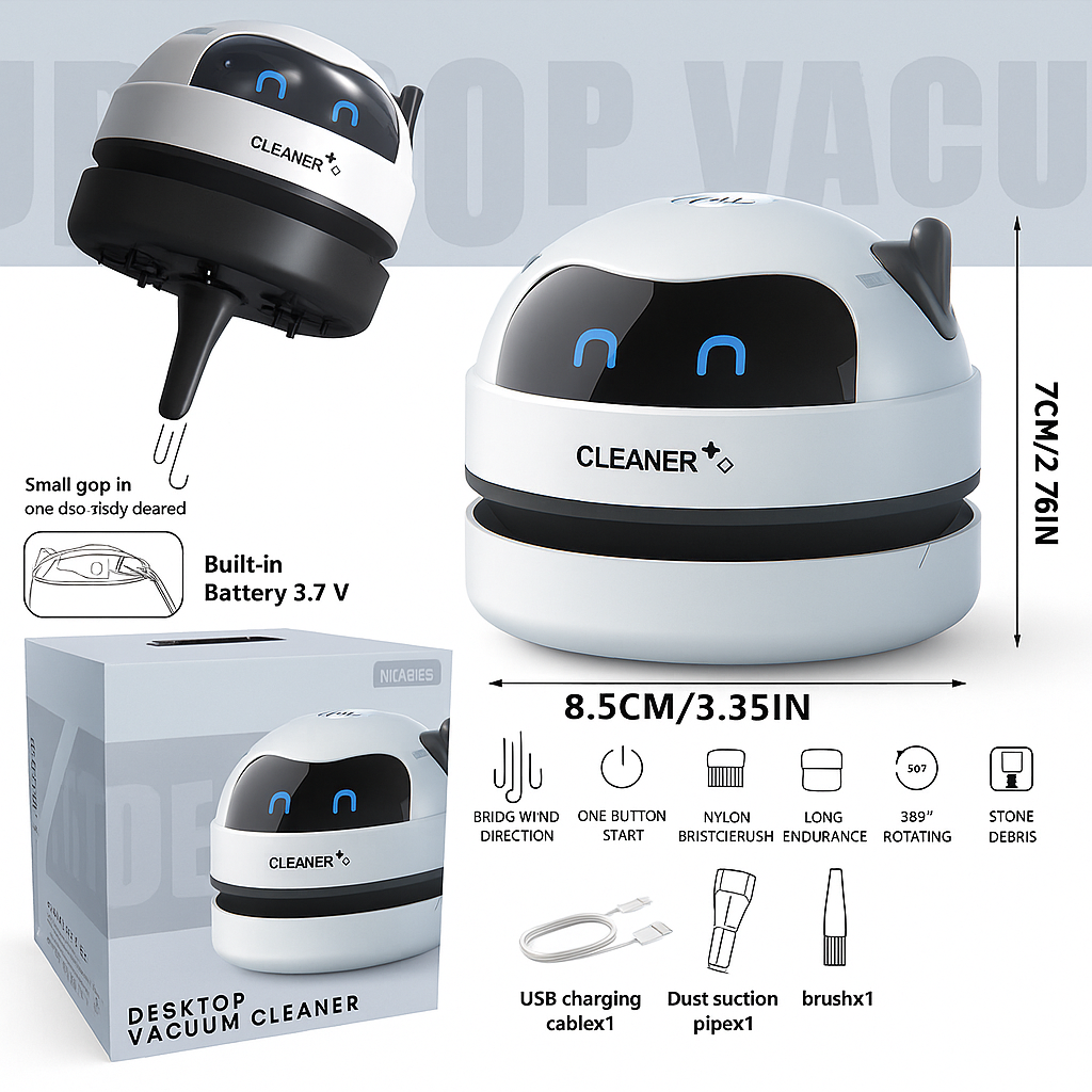 - Easy to store: This desktop vacuum cleaner has a compact design and does not take up space. It can be easily put into a drawer or a bag, making it easy to store at home, in the office, or on a business trip.